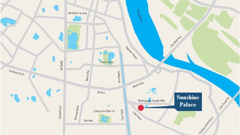 Sunshine Palace tọa lạc trên trục đường Tam Trinh – Lĩnh Nam. Từ dự án, các cư dân có thể dễ dàng tiếp cận tới các khu vực lân cận bằng 6 tuyến đường chính bao quanh với ưu điểm vượt trội của hạ tầng tiên tiến. Chỉ cần ít phút di chuyển, bạn có thể dễ dàng có mặt tại Hồ Gươm, cũng như các tiện ích công cộng hàng đầu khu vực như Bệnh viện Bạch Mai, các trường đại học hàng đầu như Đại học Bách Khoa, Đại học Xây Dựng, Đại học Kinh tế quốc dân, công viên Yên Sở, cầu Vĩnh Tuy, các trung tâm thương mại quy mô lớn,…